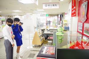 会議室でコミュニティ課の仕事を説明した後、1階総合案内の後ろにある浦和レッズコーナーの装飾を手伝ってもらいました。