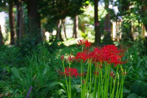 上町氷川神社では鳥居をくぐるとすぐにヒガンバナが咲いています。ここは、本殿の裏手にもアジサイなどの様々な植物が植えられ、季節ごとに楽しめる場所です。