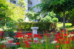 与野ハウスは、1976年に建設された日本初のタワーマンションと言われています。17号国道に面した公開空地に毎年ヒガンバナが綺麗に咲きます。