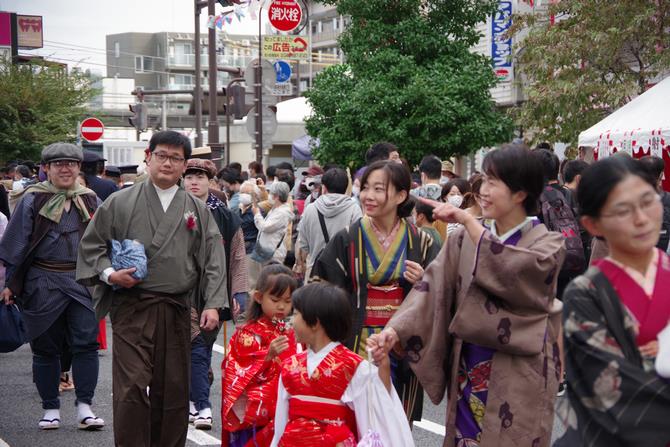 地域のお店や団体の出店や、ステージパフォーマンスなどもありますが、なんといっても一番の見ものは大正時代の衣装を身に着けノスタルジックな時代的雰囲気を再現した仮装パレードです。