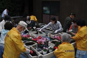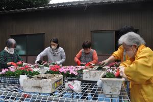 古い花を撤去し、30株の花苗を10個のプランターに植え付けていきます。
