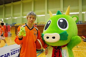 試合終了後、ヌゥと得点ボードのところで写真を撮っていると、今シーズンのヌゥ担当野口龍太郎選手(#30)が来てくれたので、一緒に写真を撮らせてもらいました。