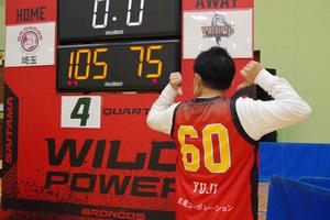 試合は、第1クォーターから第3クォーターまでさいたまブロンコスが終始リードを保って61対53でしたが、第4クォーターに逆転を許し一時は9点差まで広げられてしまいました。しかしここから奮闘し、3ポイントシュート3本で終了間際に追いつきました。延長に入ってからも攻勢は続き、89対86で見事開幕戦勝利を飾りました。