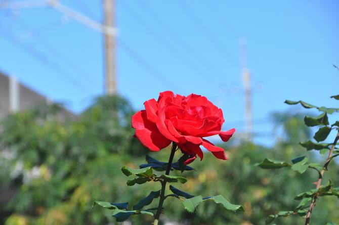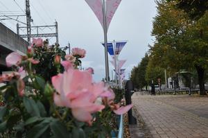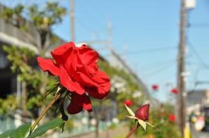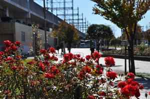 与野本町駅東口は、駅の北側にある背の高いバラの上の方に綺麗に咲き、南側の方は赤いバラがたくさん咲いていました。