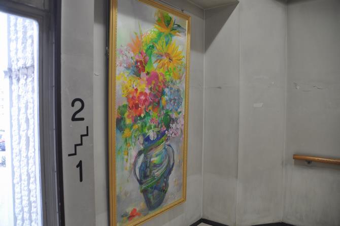 区役所庁舎東側のバスケ壁画を書いてくれた寿の色さんの絵画を庁内東側階段の1階と2階の間の踊り場の壁に飾りました。