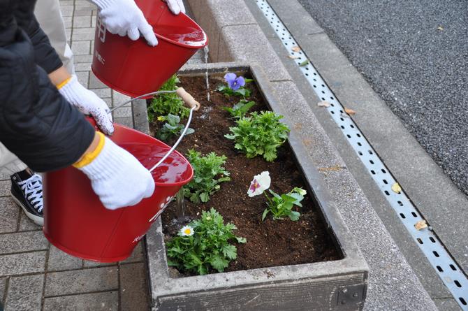 花が植えられたプランターは、与野南小学校の通学路に並べられます。