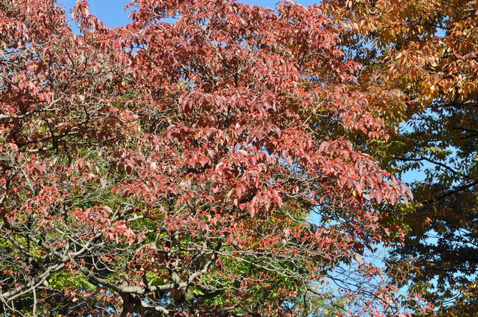 北側の遊具があるところではハナミズキが紅葉し真っ赤な実がたくさんついていましたし、弁天池では鴨が羽を休めていました。