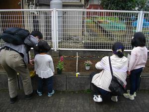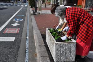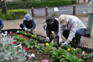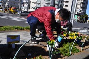 自治会の皆さんが稲荷町児童遊園地、稲荷町自治会館への入り口通路、駅前通りの3か所に花を植えました。