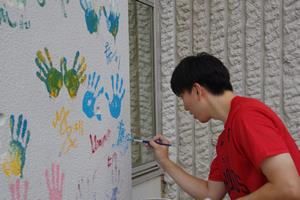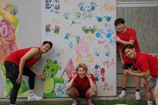 教室終了後には恒例行事として、中央区役所東側にある壁に選手4名の手形を新たに追加しました。
