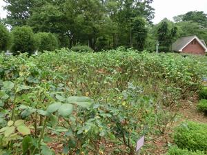 レッズローズの咲き終わった花柄を20分ほどで切り終えることができたので、残りの時間で、駐車場入口南側花壇の一部を剪定しました。