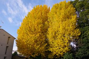 昨年も今頃だったと思い、一山神社に行ってみると、ご神木の2本のイチョウがまっ黄色に色づいていました。