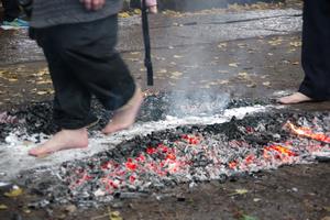 両側にはまだ火が見えますが、素足で燠火の上を渡ります。