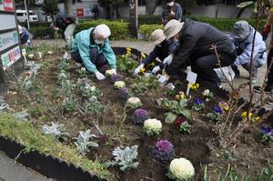 私たちが到着すると、枯れた草花を抜いて整地されており準備万端です。100株の花苗を仮置きし、どんどん植えていきます。