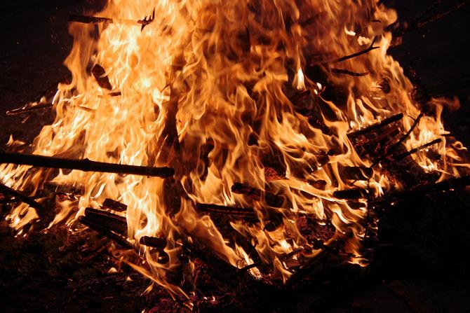 本殿での神事の後、境内に山と積まれたヒバに火がつけられます。