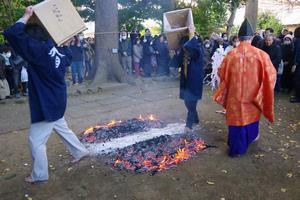 宮司さんが燃えさかる火に柚子を投げ入れ、下火になったところで真ん中に通り道を作って塩で清めます。