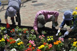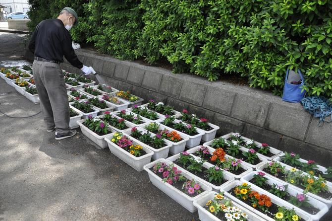 古い土をふるってプランターに入れる人、そのプランターに花を植える人、さらにそのプランターを運んで肥料をあげ水やりをする人と分業制で手際よく作業が進みます。