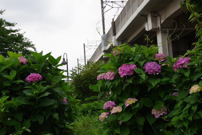 強い日差しが照り付ける暑い中ですが、あじさいは元気に咲いていました。