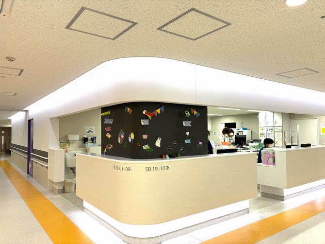 5階B病棟が小児病棟となります。保育士さんも平日は19時まで常駐しています。(写真:左下)