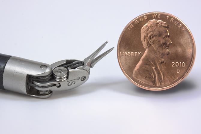 医師がロボットアームに装着されている鉗子やメスを操作します。ダビンチの鉗子はリスト構造を持ち、人間の手より大きな可動域と手ぶれ補正機能を備えています。