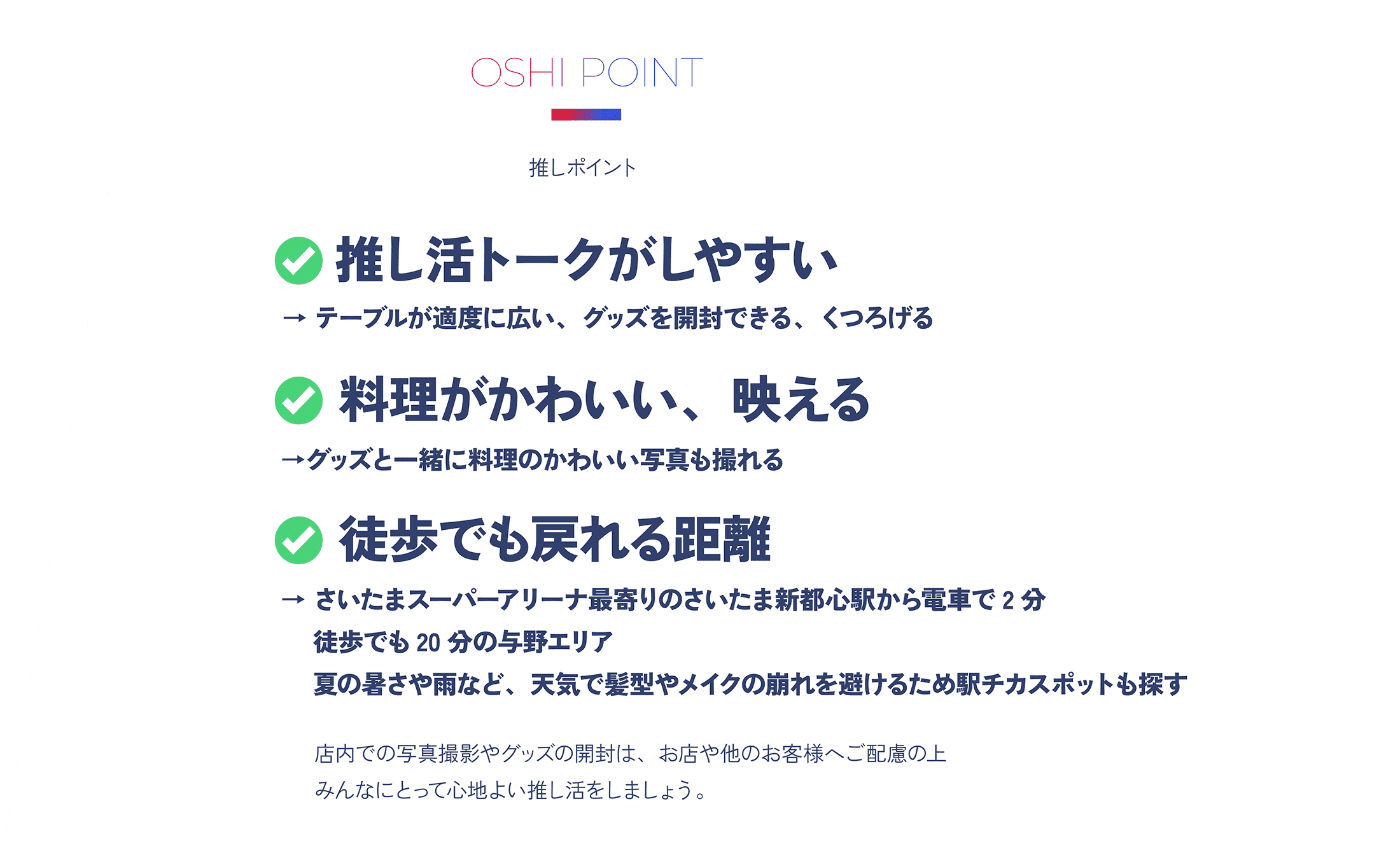 さいたまスーパーアリーナ近隣は、ライブの開演に合わせてファンが集まるので、見渡す限り人、人、人...。 お店の数も多いのですが、満席で入店できずベンチで過ごす方も。 物販で並んだ後に開演まで待つ場所や、昼夜参戦する時にちょっとひと息つける場所など、 推し活目線で「推しポイント」に合った穴場スポットを、1駅隣の「与野駅」周辺で探してみました。