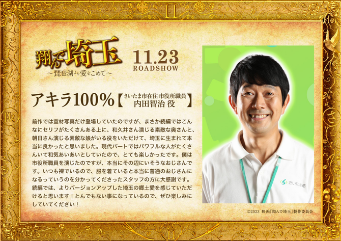 今作では、アキラ100%さんが、さいたま市在住の市役所職員役で出演されるということも発表されており、