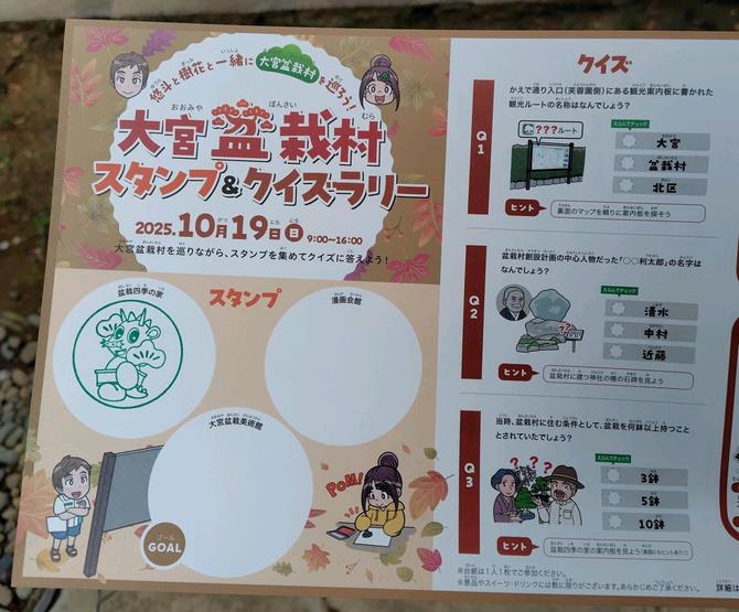 このイベント、「スタンプ&クイズラリー」では、大宮盆栽美術館・漫画会館・盆栽四季の家の3か所に設置されたスタンプを集め、3つのクイズの答えを探しながら盆栽村を巡るというもの。