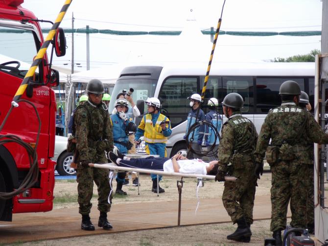 九都県市による大規模な防災訓練に参加し、防災時の対応について、患者役を通して学びます。