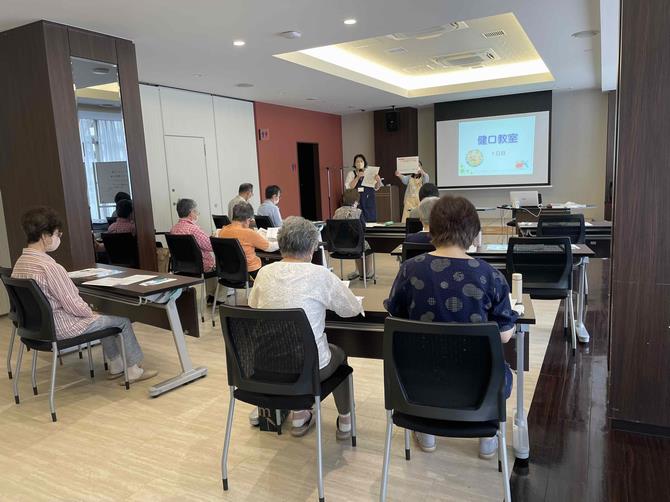 健口教室とは高齢期のバランスの良い食生活のポイントと工夫、噛む力・飲み込む力を高める体操を含む「お口の健康」について学ぶ、栄養士と歯科衛生士による全3回の教室です。