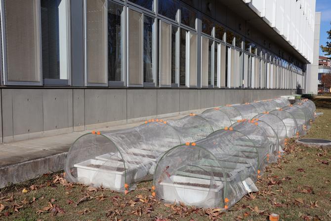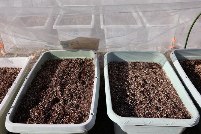 今年度も、先発分と後発分のプランターに分けて種をまきます。