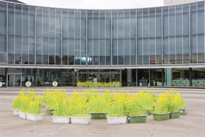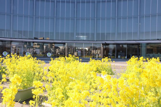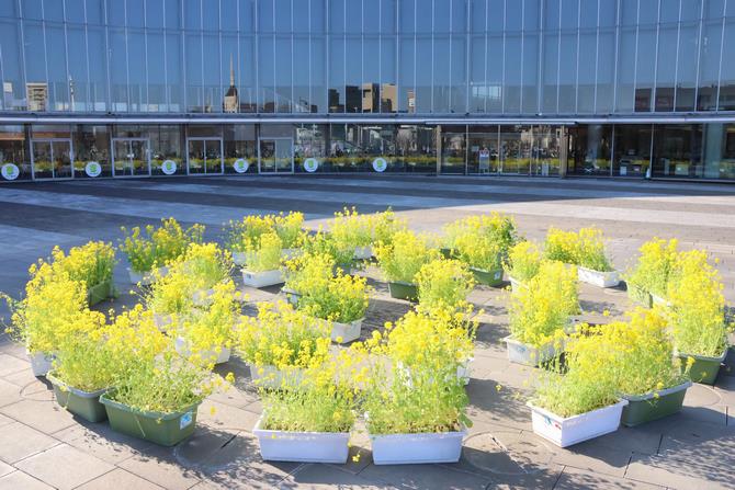菜の花に囲まれて春を楽しんでもらえるように、市民広場の真ん中に円を作る様に並べました。