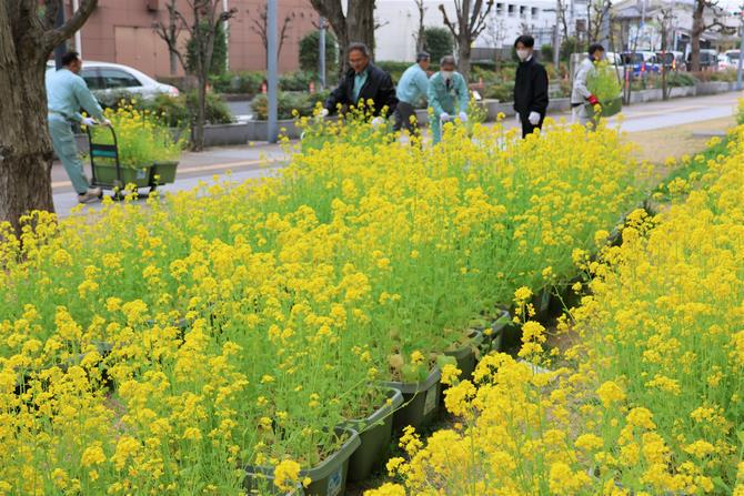 3月19日(木曜日)、プラザノース前市民広場に飾っていた先発組の菜の花が散り始めたので、