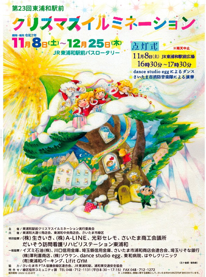 「区民の皆様が心安らかに暮らせるように」との願いを込めて、令和7年11月8日(土曜日) からJR東浦和駅前をクリスマスイルミネーションで明るく彩ります。