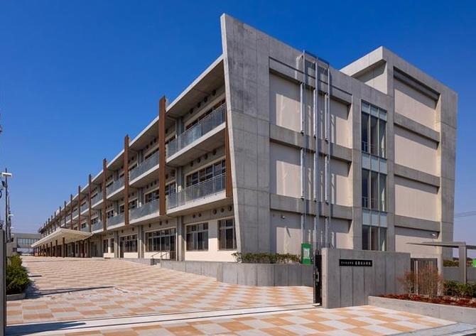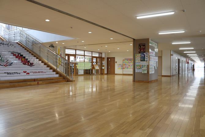 美園北小学校の自慢は、木材をふんだんに使った、明るく開放的な校舎です。教室と廊下はガラス戸で仕切られ、ゆとりのある空間が特徴です。また、太陽光パネルや雨水利用、屋上緑化などを備えた、環境に配慮したエコスクールでもあります。