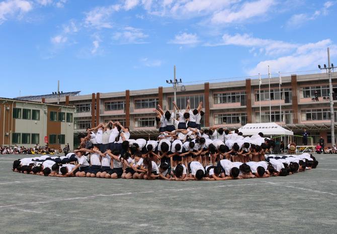 校章は、学区内の埼玉スタジアム2○〇2をイメージしています。差し色の赤は浦和レッドダイヤモンズさんを、青はサッカー日本代表の侍ブルーをモチーフにしています。開校記念に全校児童・保護者・地域の方・教職員で力を合わせて作成しました。