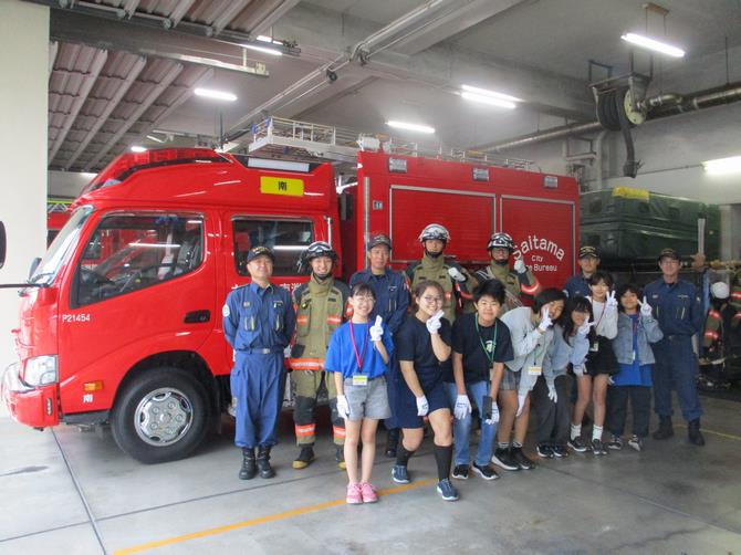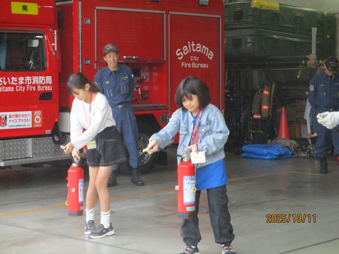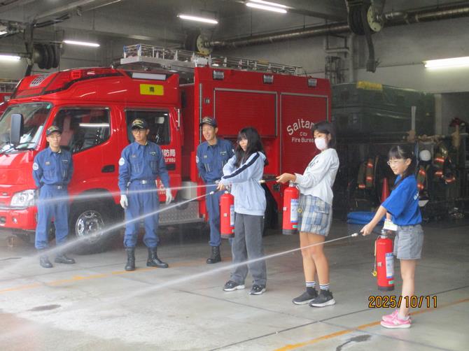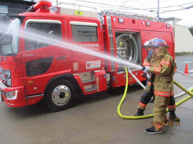 | 消防隊員と一緒に放水を体験しました | 雨が降り、肌寒い日でしたが少年団員たちは 元気いっぱいに研修に取り組みました。 |