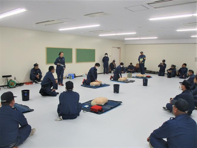 令和6年10月6日(日曜日)、西消防署において、西ブロック隊消防団と広報指導分団合同の消防団研修を行いました。自主防災訓練等で必要な指導要領を習得するとともに、心肺蘇生法及びAED取扱いについて技術の向上を図りました。消防団は地域の安心安全を守るため頑張っています。
