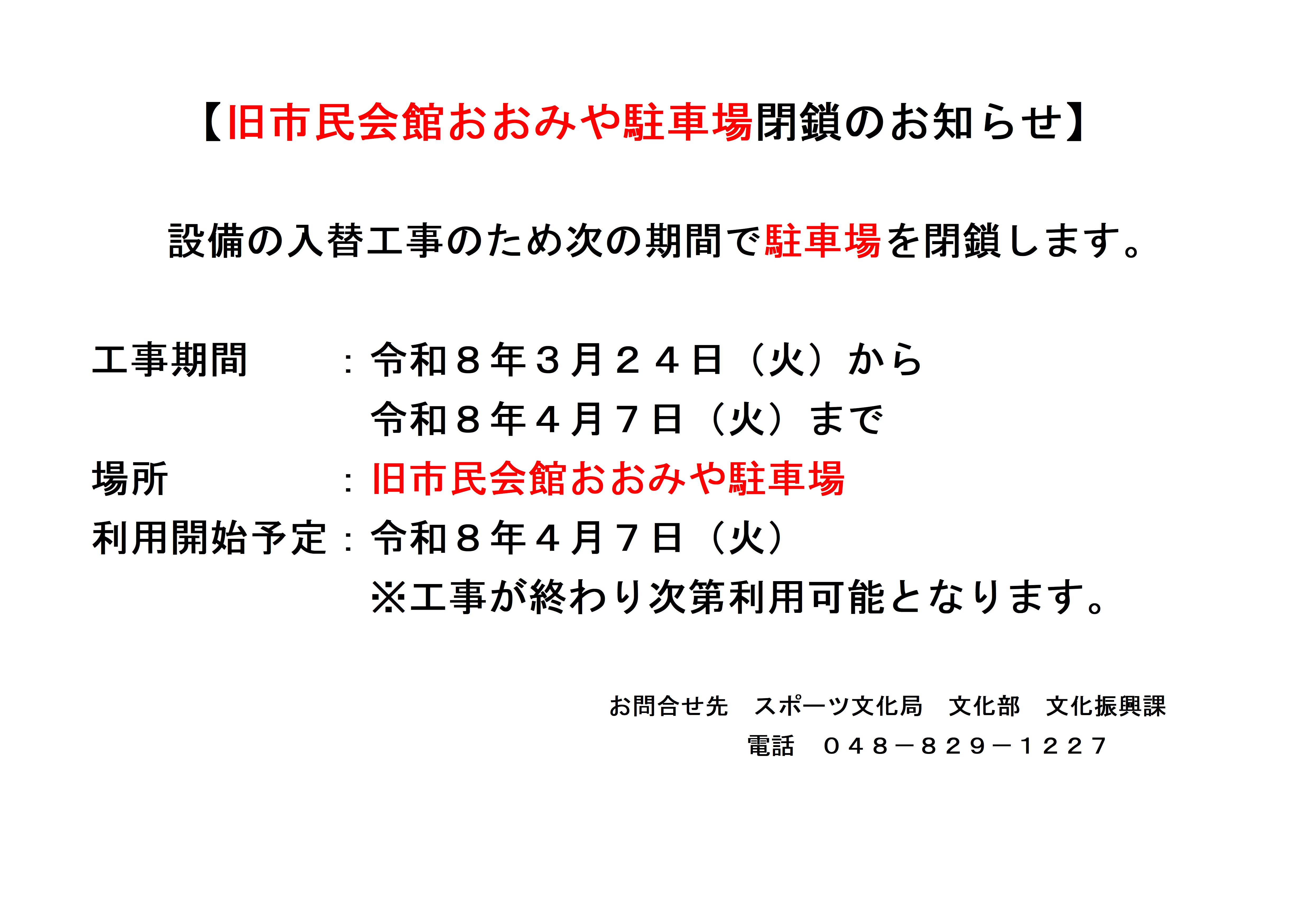 ※閉鎖に伴う代わりの駐車場のご用意はありませんが、大宮区役所地下駐車場は通常通り使用できます。