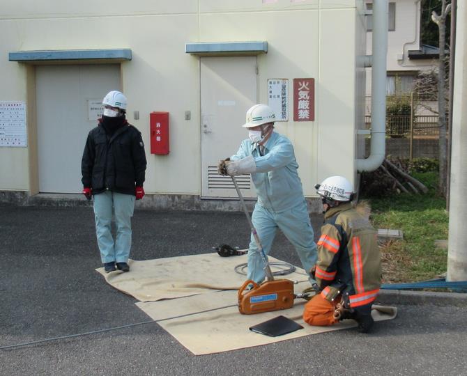 くらし応援室に導入された目的は交通事故等で歪んだガードレール等の応急処置などに活用し市民サービスの向上に役立てます。消防では主に交通事故現場で救助が必要な場合に使用することが多く、一般的な障害物(重量物)の除去、資機材の移動などにも使用しています。今回の訓練で消防の技術や知識を共有することができ実のある訓練となりました。