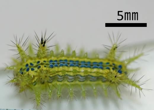 ・体色 :黄緑色で、背部に青色の線状模様があります。成熟幼虫になると赤色の突起が目立つようになります。