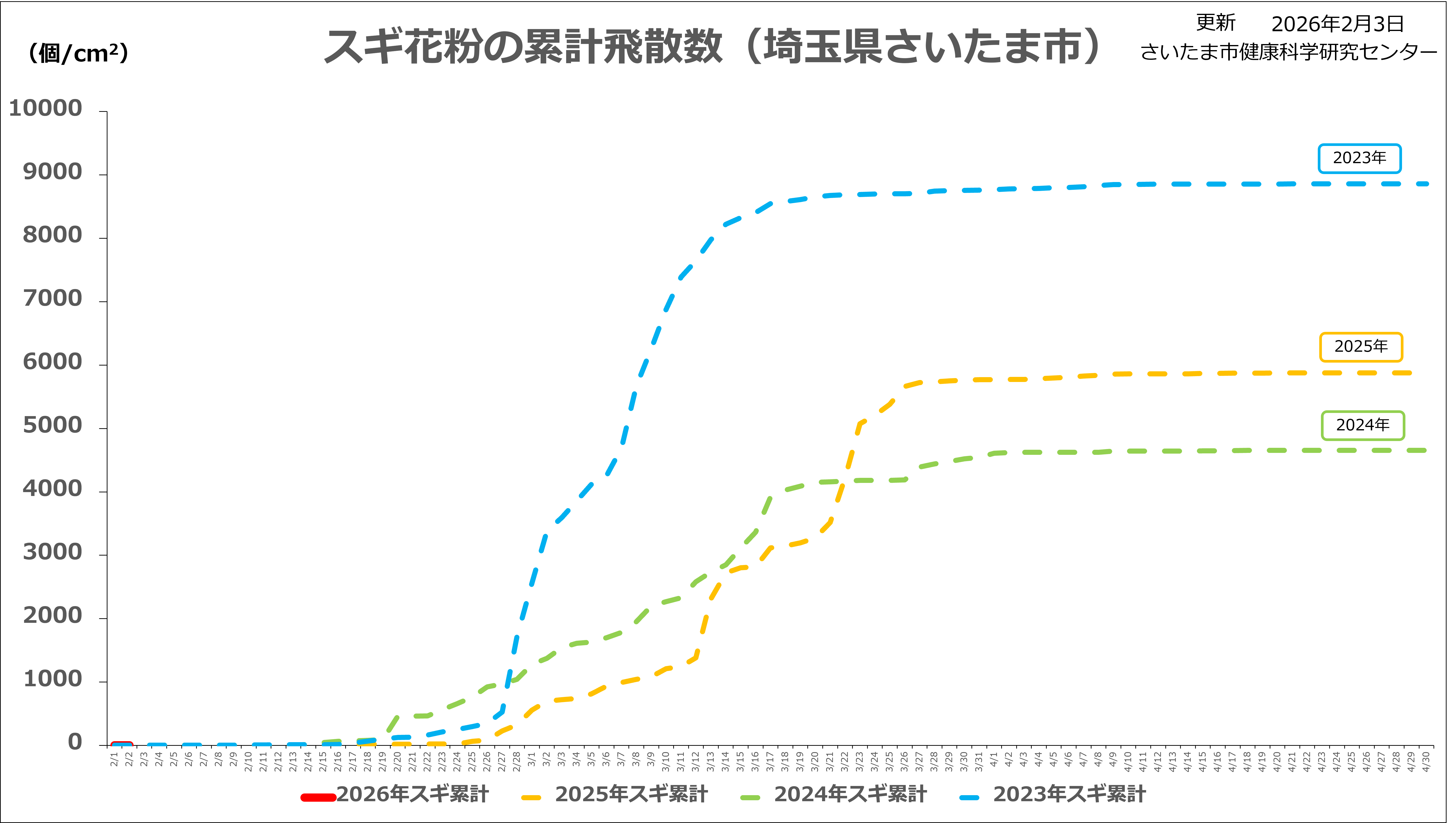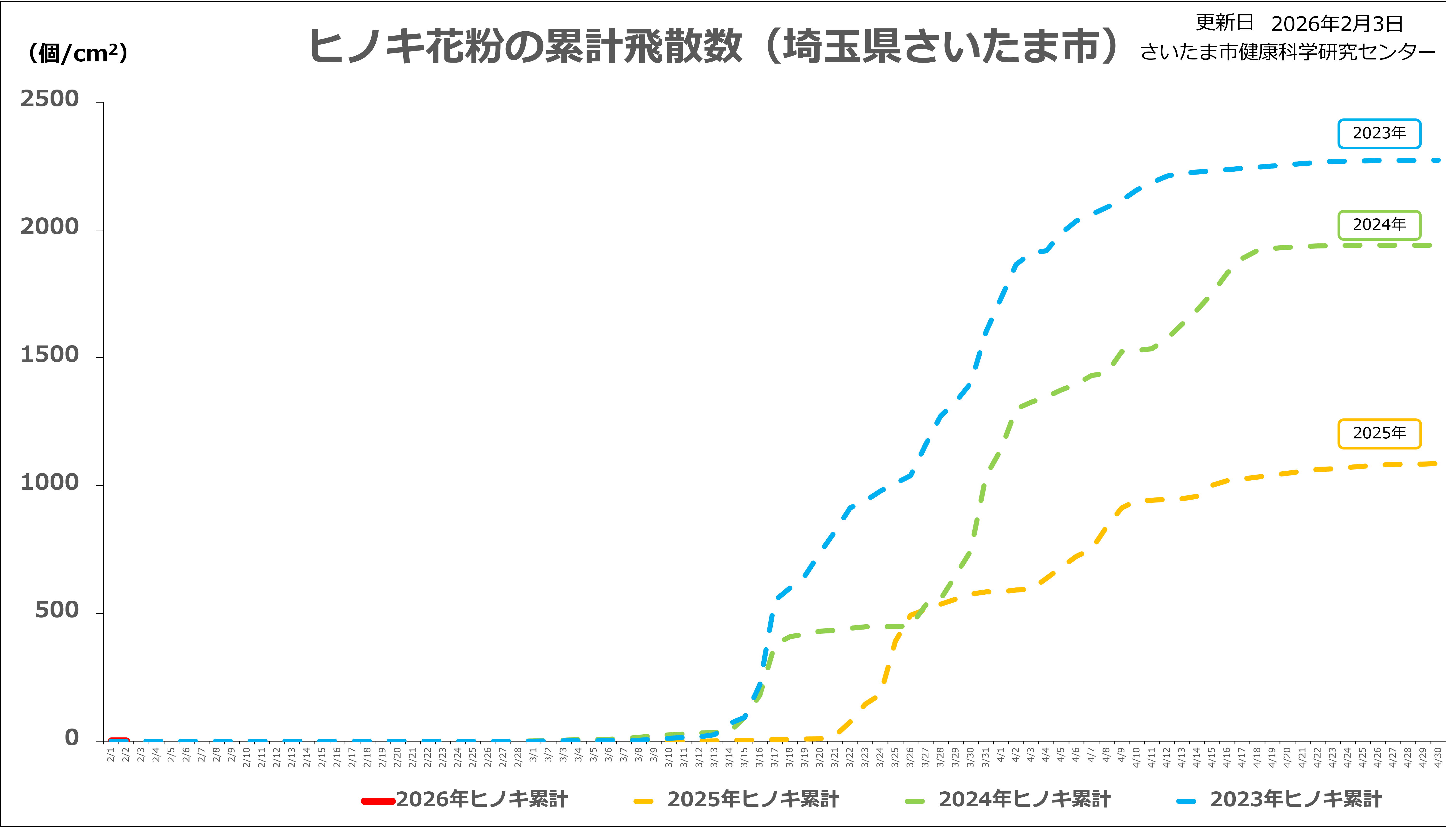 2026年埼玉県さいたま市におけるスギ・ヒノキ花粉の測定結果を公開しています。(測定場所:さいたま市健康科学研究センター屋上)