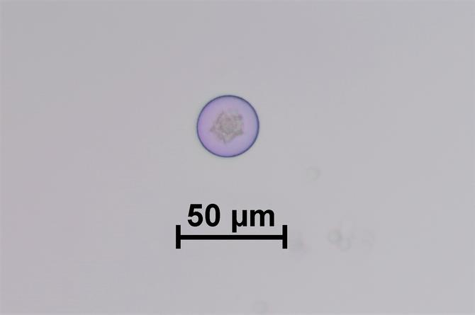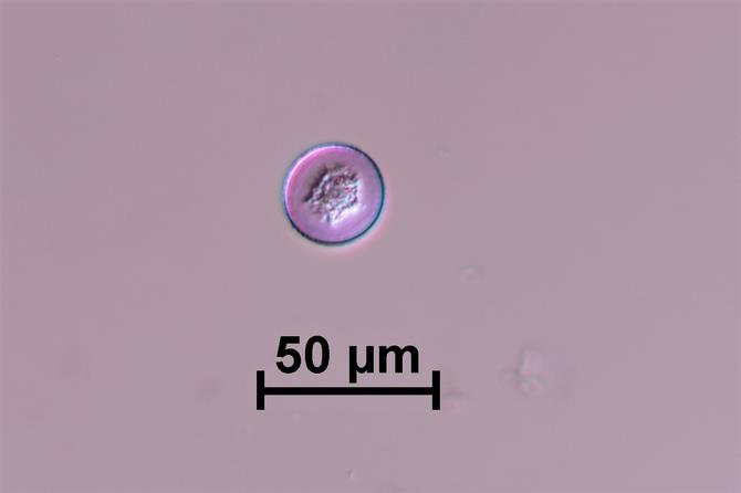 当センターでは、ダーラム型花粉捕集器を用い、ワセリンを塗布したスライドガラスに捕集された花粉を、ゲンチアナバイオレットで染色し、顕微鏡で観察、測定しています。