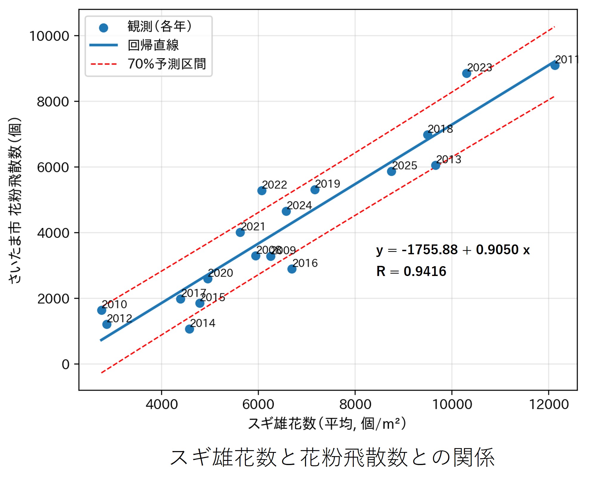 スギ花粉飛散数予測は、環境省が公表するスギ雄花花芽調査の結果と、さいたま市におけるスギ花粉飛散数の相関関係を基に算出しています。