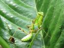 そして、少し大きめの緑色カマキリが、威嚇するかのようにおしりを高く上げている姿も発見しました。