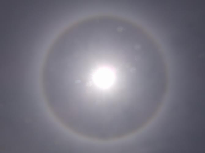 上空の太陽の周りに白い光と虹色の円「ハロ」が観察されました。