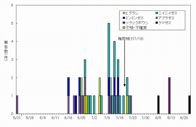 セミは、種類によって鳴く時間帯が大体決まっていると言われています。クマゼミは午前中、ツクツクボウシやアブラゼミは朝方と午後、ミンミンゼミは午前中、ニイニイゼミは早朝から夕暮れ、ヒグラシは朝か夕方に鳴くと言われています。今回、報告数が多かったアブラゼミやニイニイゼミについては、同じような傾向が表れたようです。