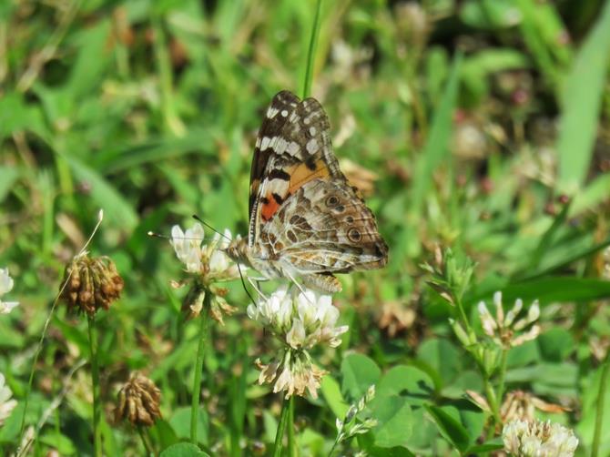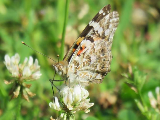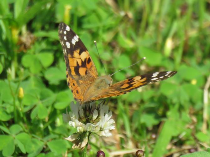 敷地内のシロツメクサで吸蜜しているヒメアカタテハを発見しました。